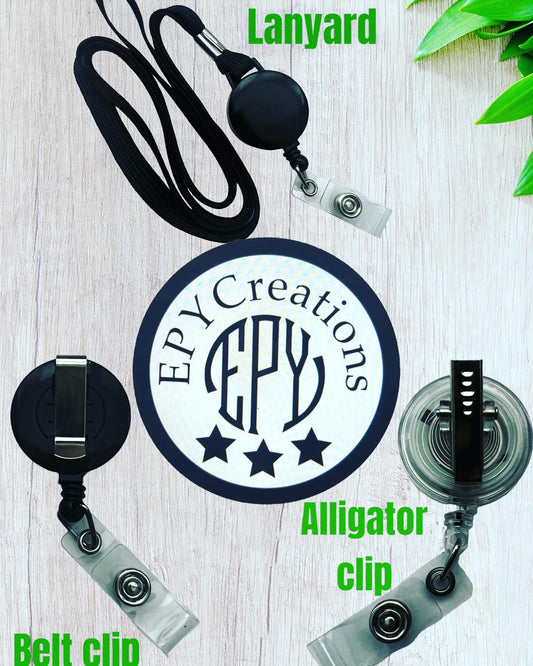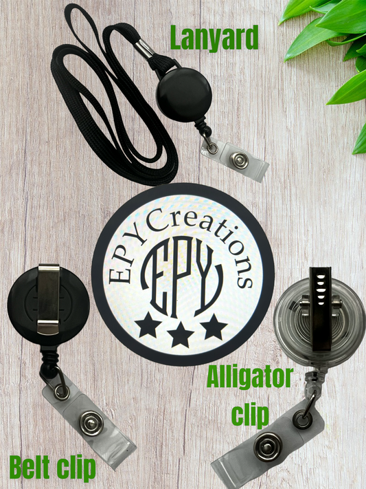Epycreations@yahoo.comAll our badge reels on our collection may be customized with different colors, adding names, even adding your logo! Email us for more details!
