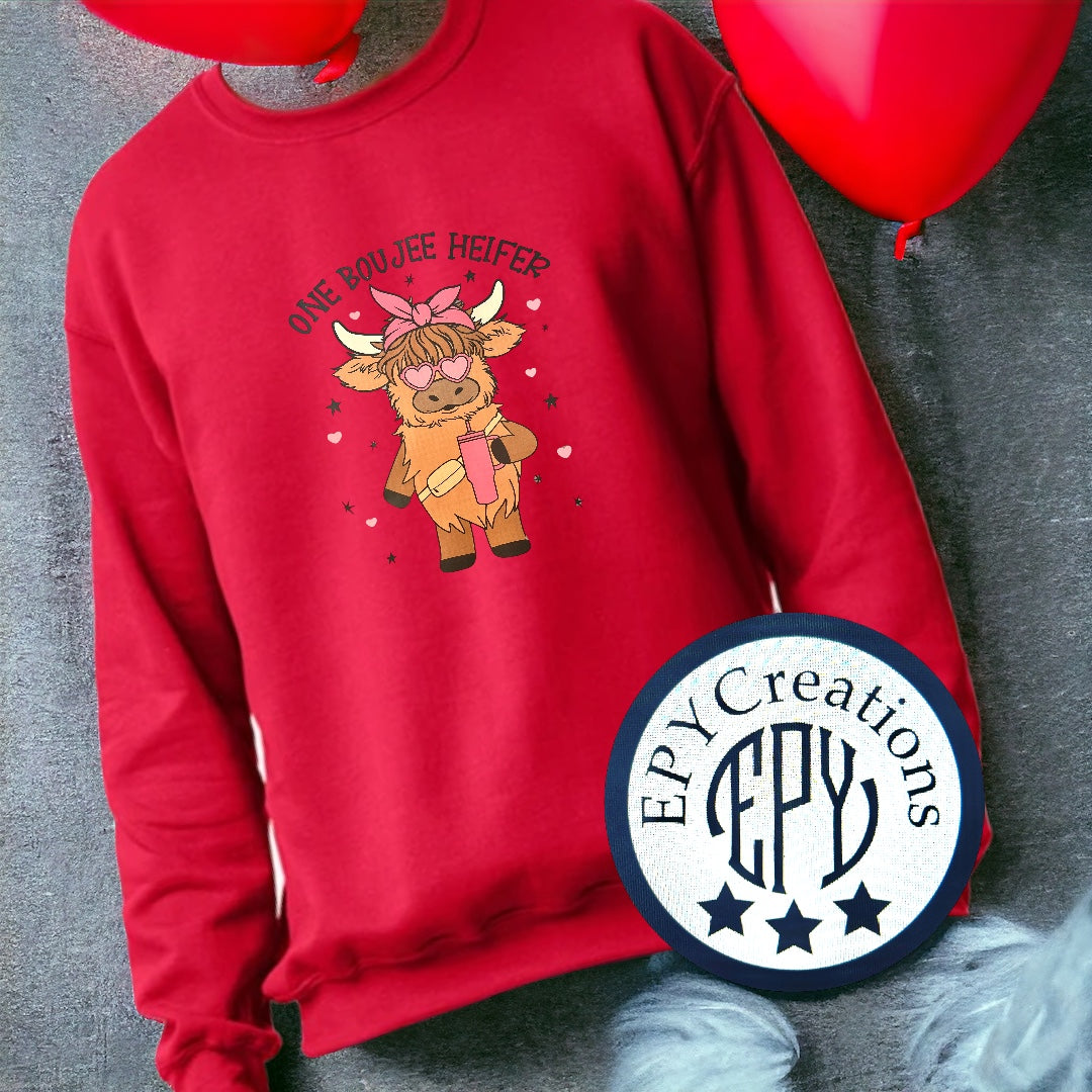 Unleash your inner boujee with our One Boujee Heifer Valentine Tee. Made with high-quality Gildan Softstyle tees or crewnecks, this tee allows you to show off your true self this Valentine's Day. Embrace your inner heifer and make a statement with this unique and comfortable tee.