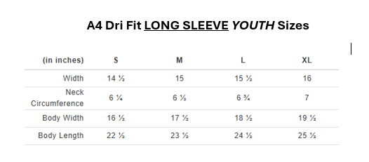 ALL Dri fit tees (and Long Sleeve) are A4 brand. Youth and Adult Sizes. Features: