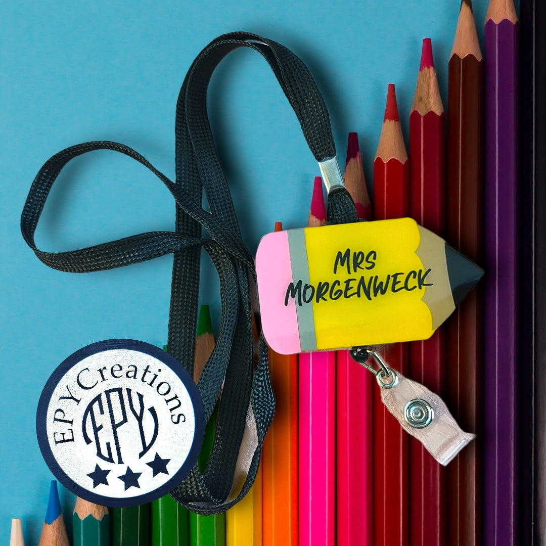 This Teacher Pencil Badge is crafted from acrylic and features a vibrant solid yellow design, personalized with your chosen name for a unique touch.